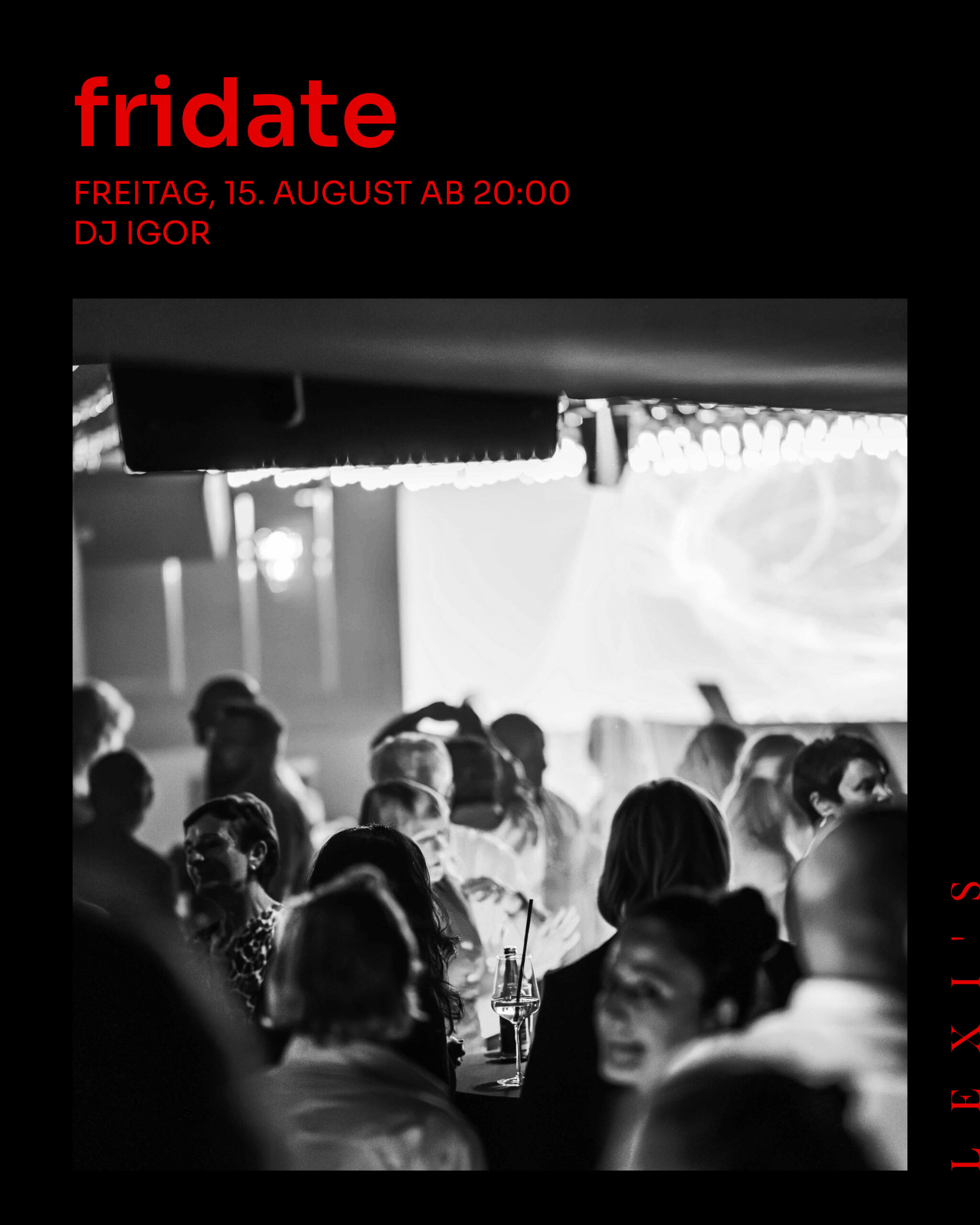 Jeden Freitag von 20:00 bis 23:00 Uhr wird im Lexi’s zu den rhythmischen Klängen des Disco Fox das Tanzbein geschwungen – und ab 23:00 Uhr geht es nahtlos weiter mit „Classics“, einer abwechslungsreichen Musikauswahl von den 80ern bis heute, die für jeden Geschmack etwas bietet!a